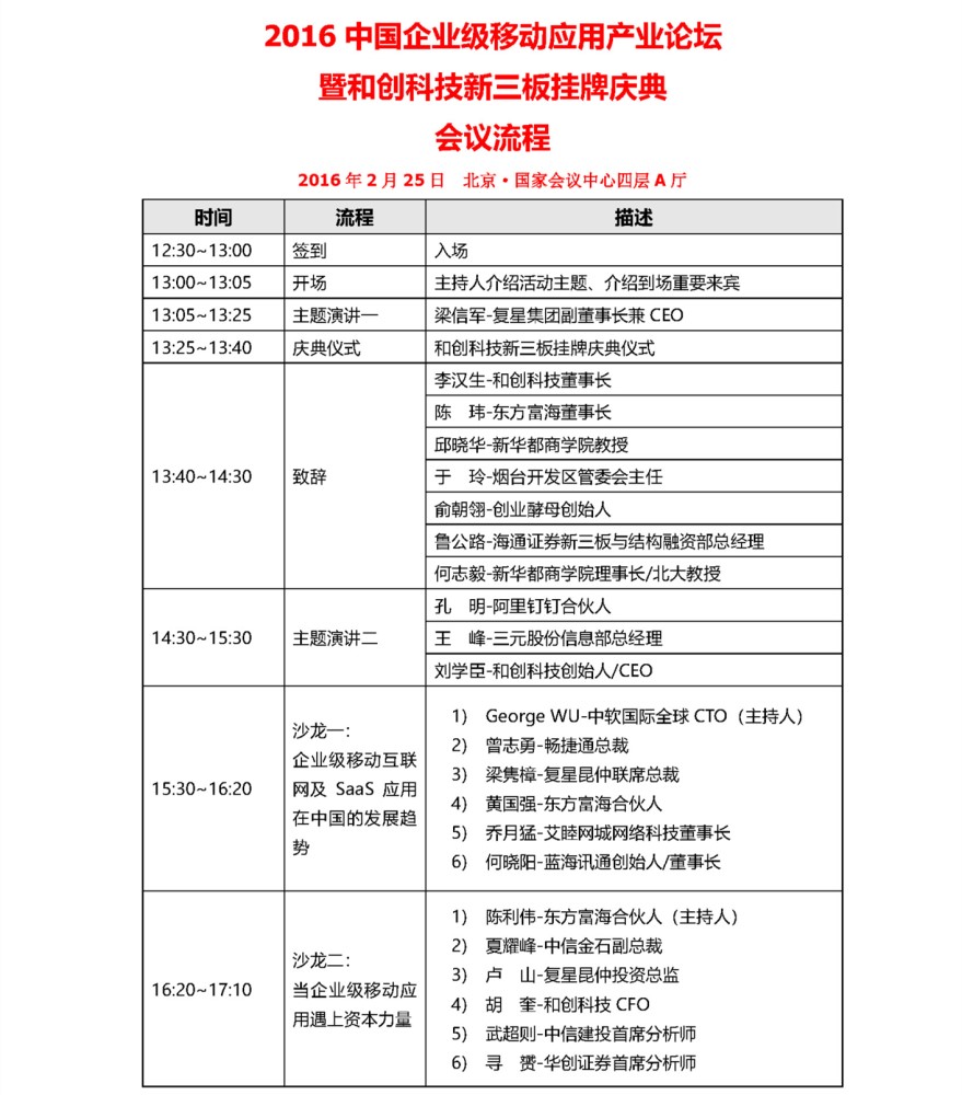和創(chuàng)科技(證券代碼834218)作為中國企業(yè)級(jí)移動(dòng)互聯(lián)網(wǎng)SaaS應(yīng)用第一股,是在和創(chuàng)科技各位股東、客戶、合作伙伴及團(tuán)隊(duì)的長期支持和卓越努力下,服務(wù)了國內(nèi)近十萬家企業(yè)。作為產(chǎn)業(yè)級(jí)SaaS移動(dòng)應(yīng)用的領(lǐng)軍企業(yè),和創(chuàng)科技將聯(lián)合復(fù)星昆仲、東方富海、新華都商學(xué)院于2016年2月25日下午在北京國家會(huì)議中心共同舉辦“2016中國企業(yè)級(jí)移動(dòng)應(yīng)用產(chǎn)業(yè)論壇暨和創(chuàng)科技新三板掛牌慶典”,這即是答謝各位股東朋友們的長期支持,也是剖析產(chǎn)業(yè)級(jí)SaaS行業(yè)在產(chǎn)品研發(fā)、市場(chǎng)營銷、運(yùn)維續(xù)費(fèi)和資本進(jìn)入等方面的行業(yè)主題。