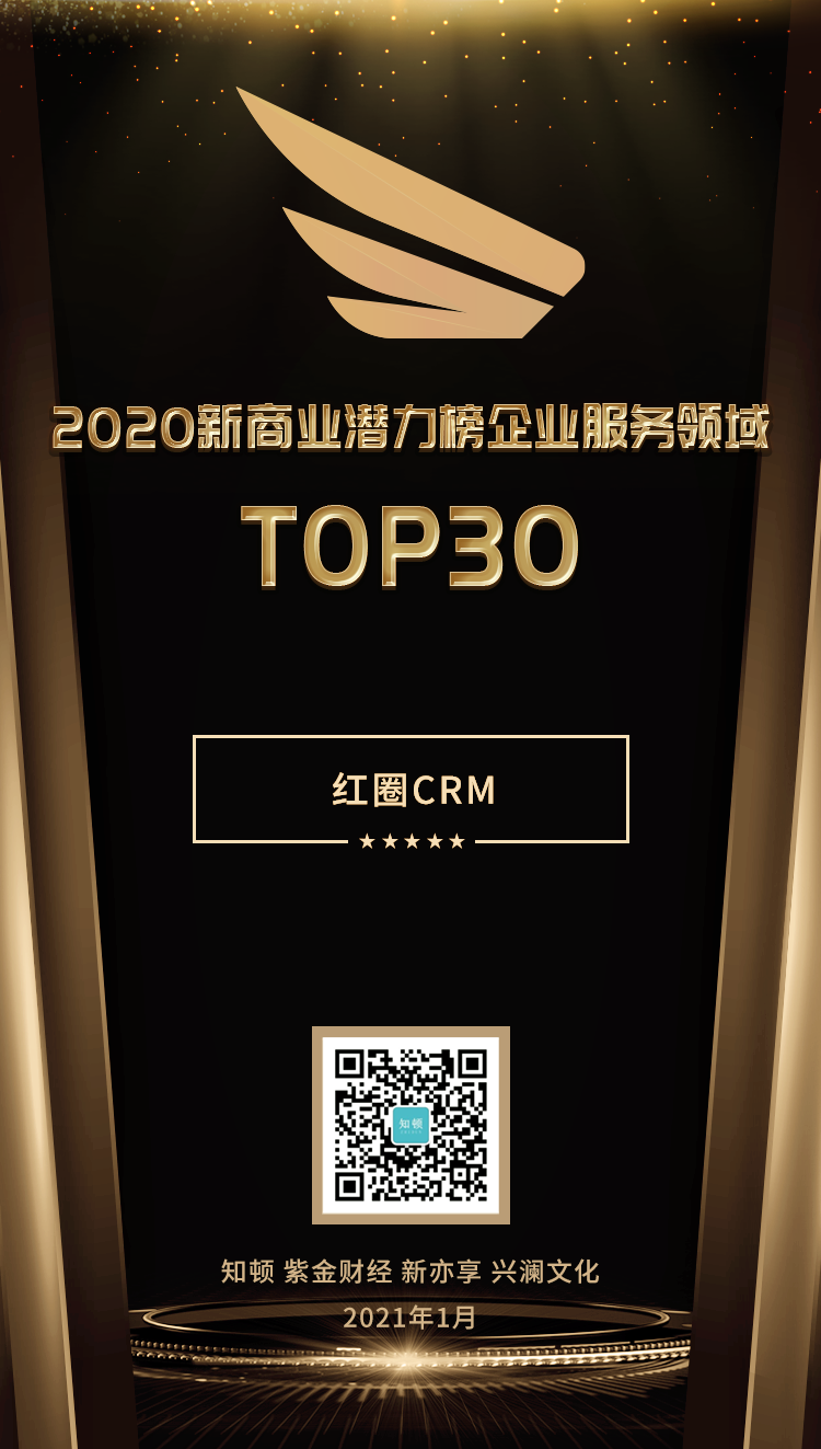 經(jīng)過層層篩選,最終,紅圈CRM 創(chuàng)始人&CEO 劉學(xué)臣入選 “2020 新商業(yè)潛力榜人物TOP20”,紅圈 CRM 入選“ 2020 新商業(yè)潛力榜企業(yè)服務(wù)領(lǐng)域 TOP30”。