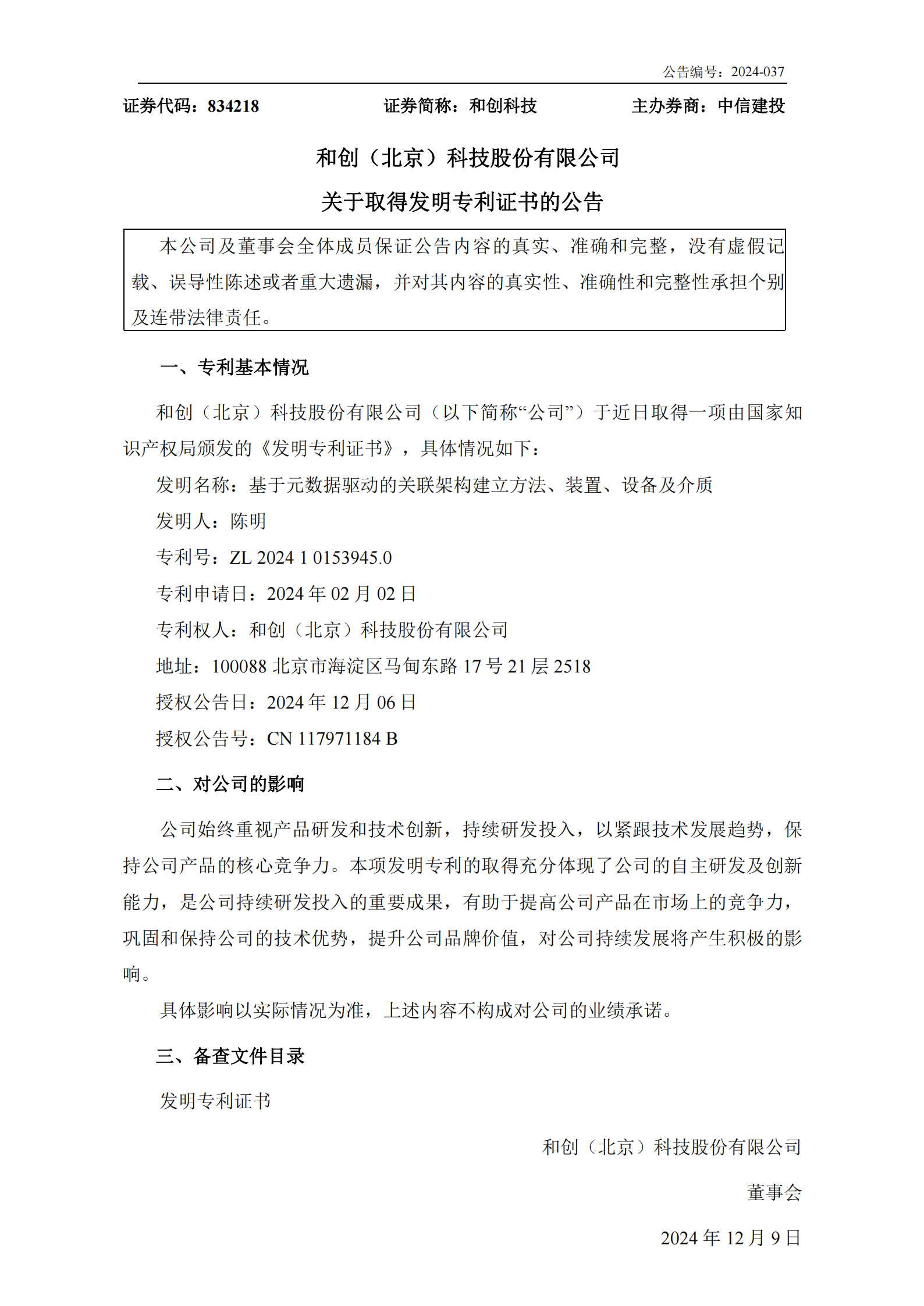 新專利的獲得是公司持續加大研發投入、注重技術創新結出的碩果。未來,和創科技將繼續秉承創新驅動發展的理念,不斷推出更多具有自主知識產權的核心技術,為客戶創造更大價值,為社會進步貢獻更多力量。