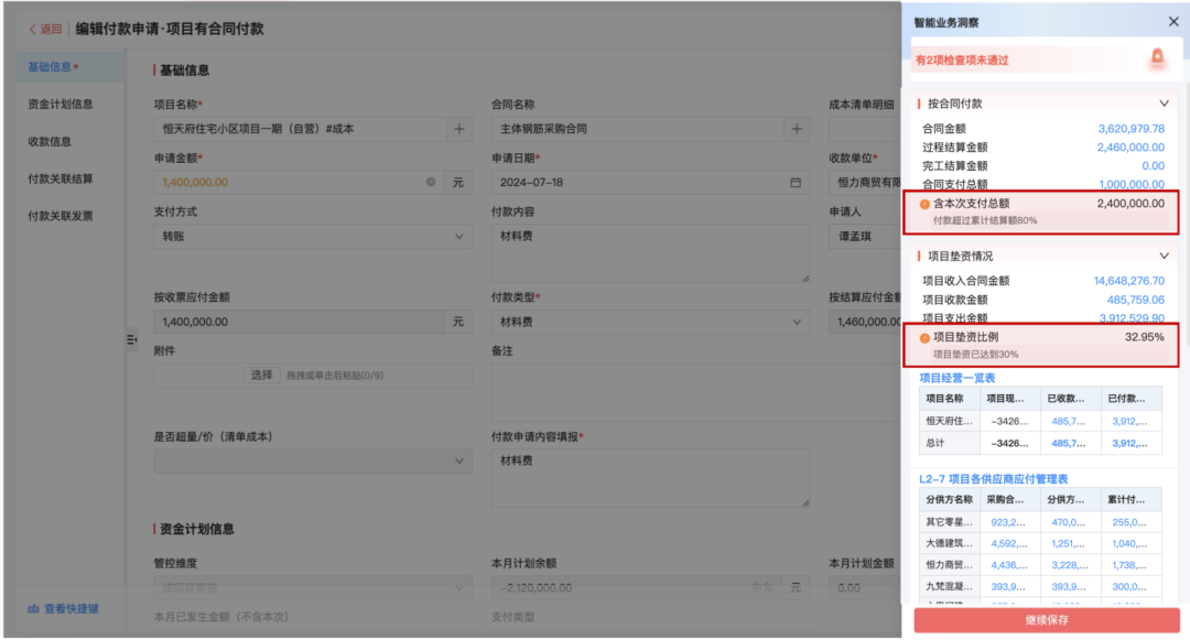 通過系統(tǒng)實(shí)時(shí)看得到公司資金情況,明確知道哪些項(xiàng)目能有資金去做去投資、哪些資金要計(jì)劃對外結(jié)算支付,項(xiàng)目現(xiàn)在開了多少票、還有多少錢沒有回,同時(shí)也能對進(jìn)度款、質(zhì)保金、投標(biāo)保證金等回款設(shè)置提醒,防止逾期未回。項(xiàng)目墊資情況也能同步關(guān)注,判斷公司的經(jīng)營狀況是否穩(wěn)健。
