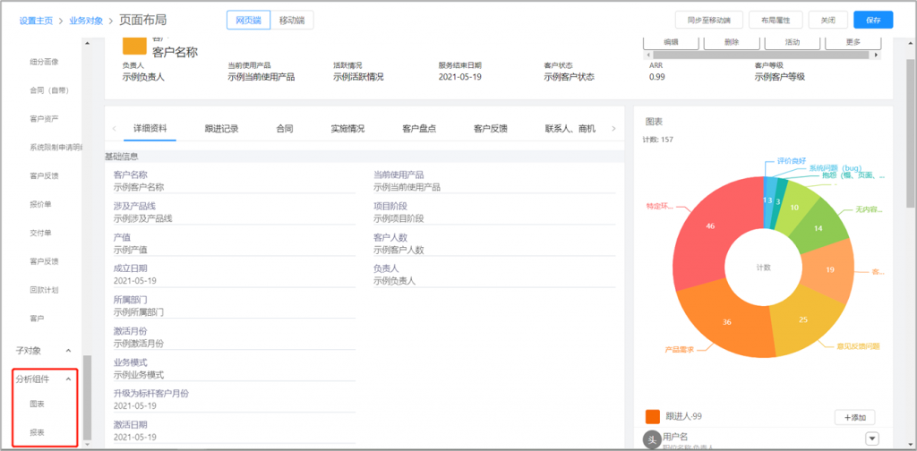 在數據資料的詳情頁面上,可以查看相關對象的報表。實現以當前數據為中心,360度視圖輕松查看分析全貌