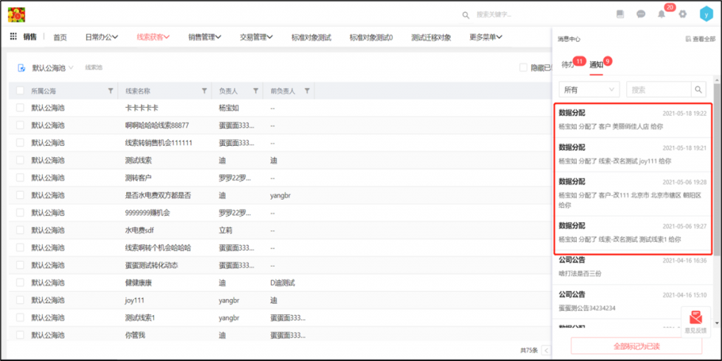 線索池、客戶池管理員分配數(shù)據(jù)后,系統(tǒng)會給新負責(zé)人發(fā)通知提醒