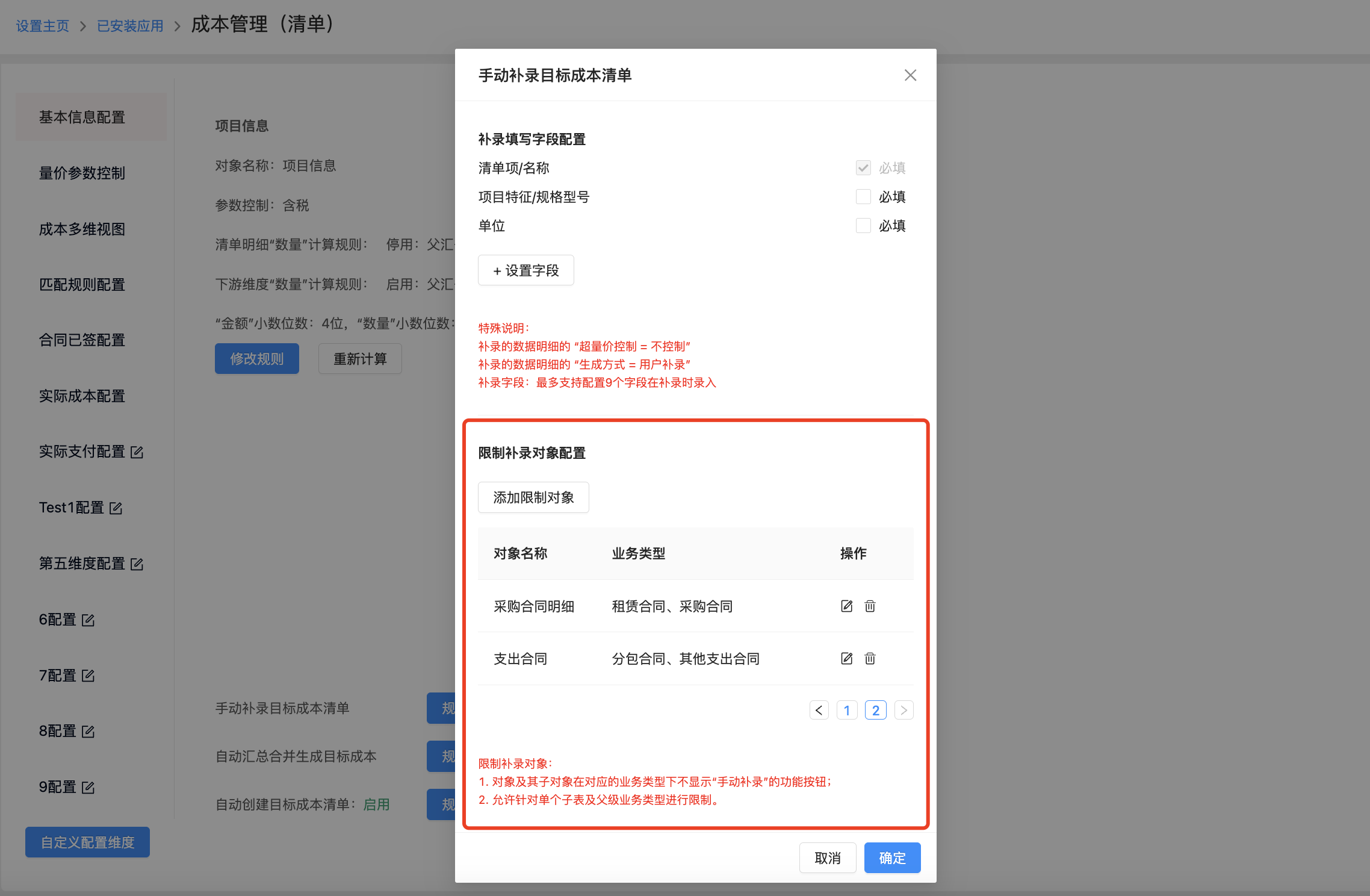 ● 手動(dòng)補(bǔ)錄成本清單明細(xì)支持限制范圍