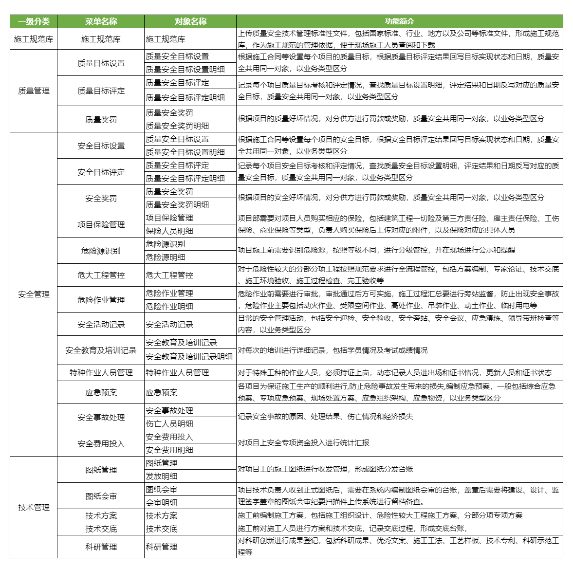 ● 工管理內(nèi)容主要針對(duì)大型總包項(xiàng)目施工現(xiàn)場(chǎng)業(yè)務(wù)管理,主要包括質(zhì)量、安全、技術(shù)管理,通過(guò)競(jìng)品分析和客戶業(yè)務(wù)分析,梳理出通用性較強(qiáng)、使用較多的功能點(diǎn),滿足客戶對(duì)現(xiàn)場(chǎng)施工管理需求。