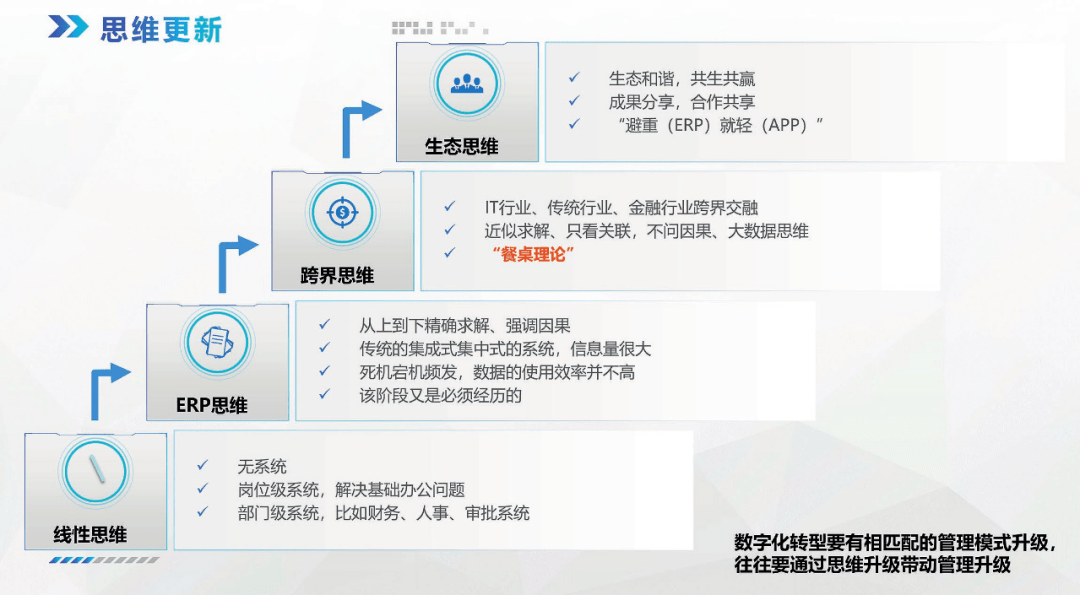 思維模式可以分為線性思維、ERP思維、跨界思維和生態思維。不同的思維方式會影響企業數字化的進程(圖6)。
