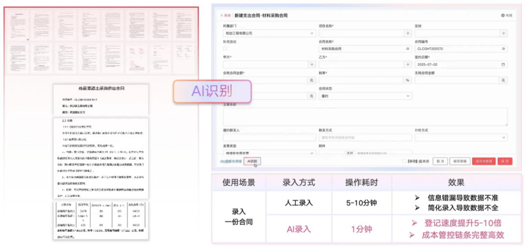 大量手寫確認單、混凝土票據、支出合同、機打送貨單和辦公登記表的錄入任務,不管是在出差途中或辦公場景中,員工只需將紙質單據拍照上傳,即可實現一鍵識別與系統自動錄入,徹底擺脫繁瑣工作、減少重復勞動。