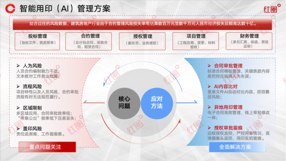 為解決上述痛點,紅圈構建了“AI智能核驗、全流程數字化、智能硬件保障、全場景覆蓋”四位一體的全方位用印風控體系。