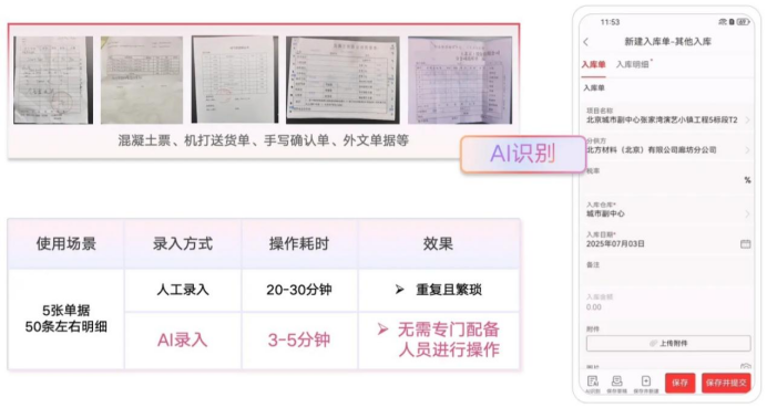 數(shù)據(jù)的源頭是業(yè)務(wù)單據(jù),錄入的繁瑣與錯誤是成本失控的隱患之一。紅圈AI系列智能產(chǎn)品中的AI錄單助手作為企業(yè)的“智能掃描儀”,能通過大模型自動識別混凝土票、送貨單、手寫確認(rèn)單乃至合同等各類單據(jù),實現(xiàn)從圖像識別到高質(zhì)量系統(tǒng)錄入的秒級閉環(huán),可減少90%人工操作。它不僅能提取關(guān)鍵字段,更能智能匹配合同明細、關(guān)聯(lián)歷史數(shù)據(jù),讓成本歸集更智能、溯源更方便,從而迭代了整個成本管控流程。