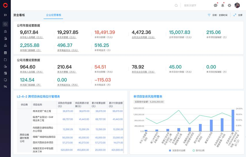 ● 實時監控單項目/多項目的應收、應付、墊資數據,合同流、發票流、資金流全鏈路透明化,規避超付風險。管理層可一鍵查看資金動態,確?,F金流穩健。